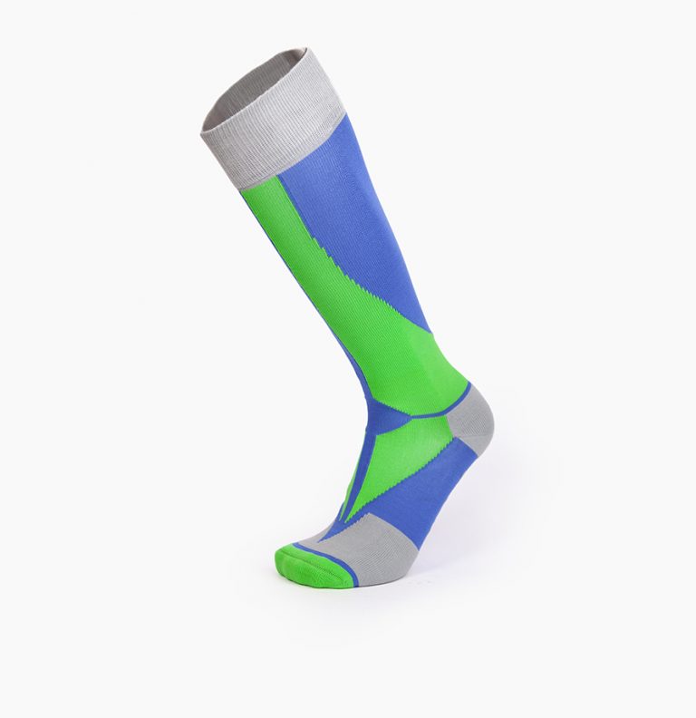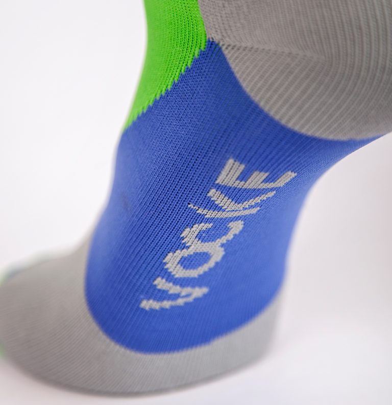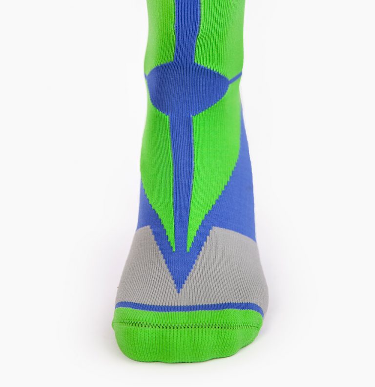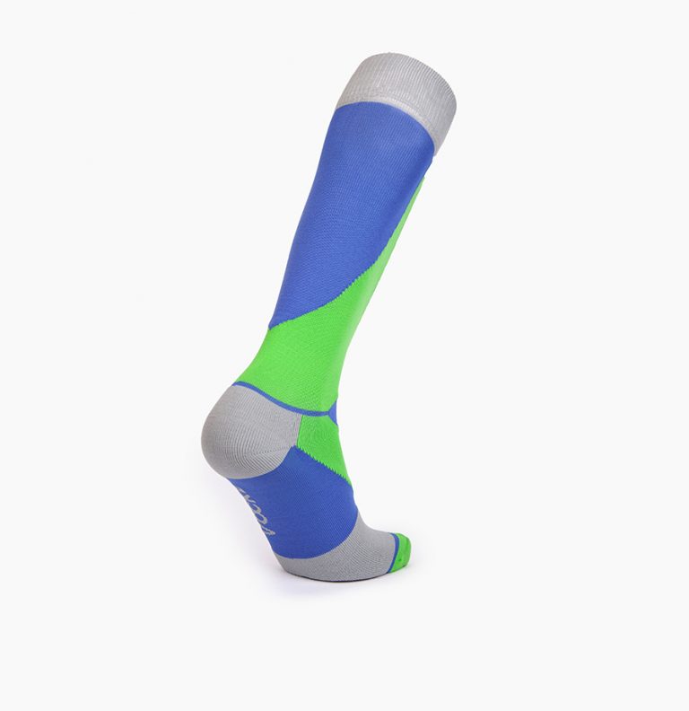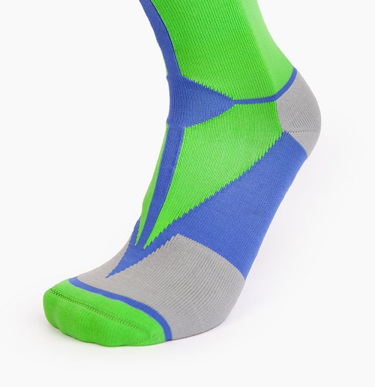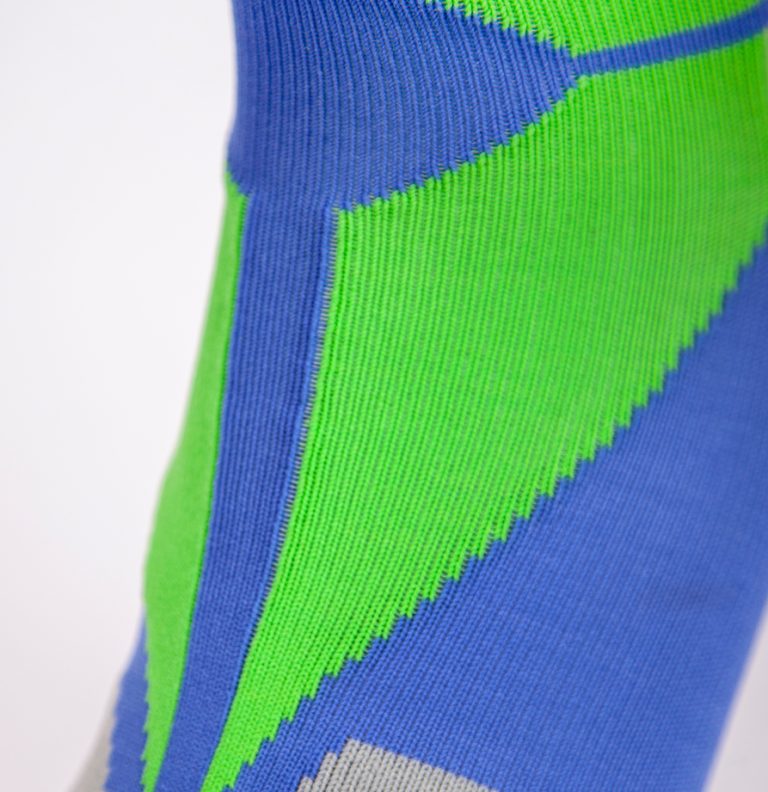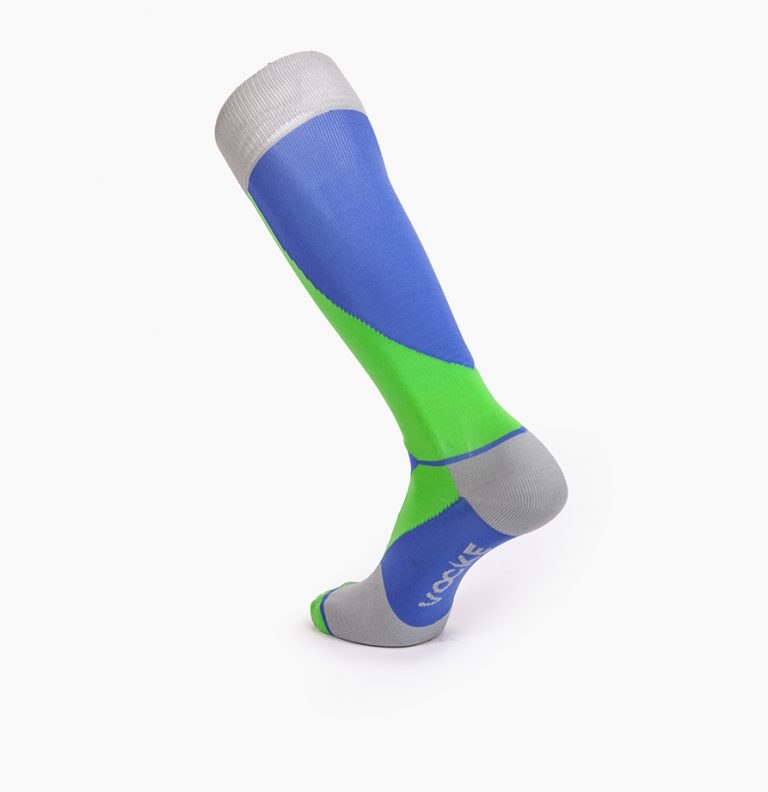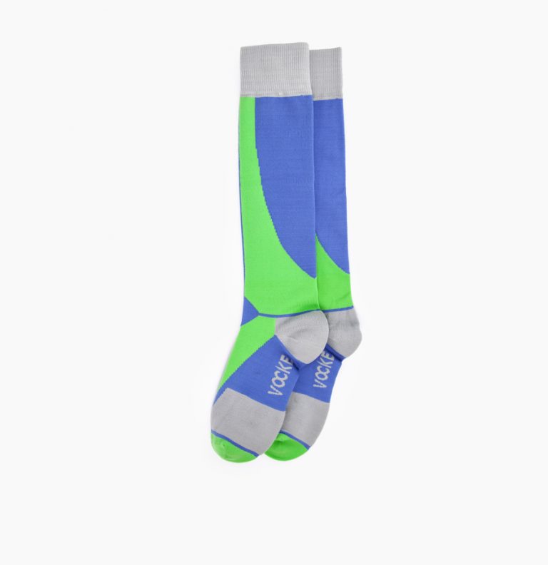 Calcetín deportivo con mucho estilo, diseño con compresión en el puente, ergonómico que absorbe y reduce la fricción siendo cómodos con la máxima proteccion para tu pie. El arco de ajuste perfecto, sin costuras para la unión de los dedos, con protectores frontales. Talon y puntera reforzados para proteger de zonas de mayor fricción. Vocke te acompaña y te cuida. Composición: Jacquard material 98% F70D-Nylon y 2% de L3070 Lycra. Color: Azul + Verde